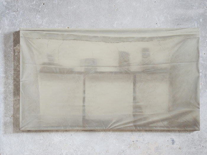 shadows behind – Ahmad Rafi works on two different levels. One is on the painted canvas itself and the other is the objects projected onto the material from behind. Installation view, Atelier Konrad Franz , Hausen 2018